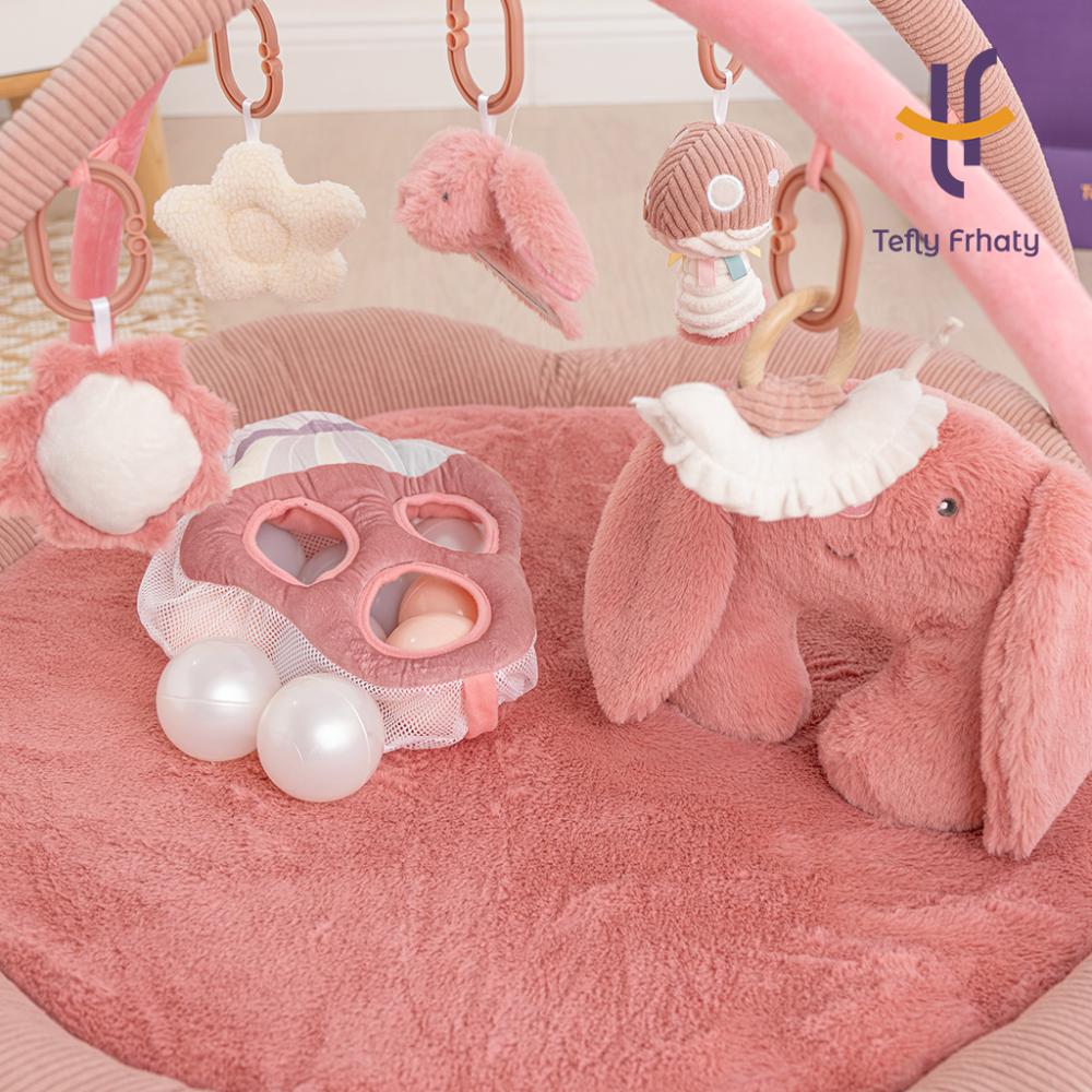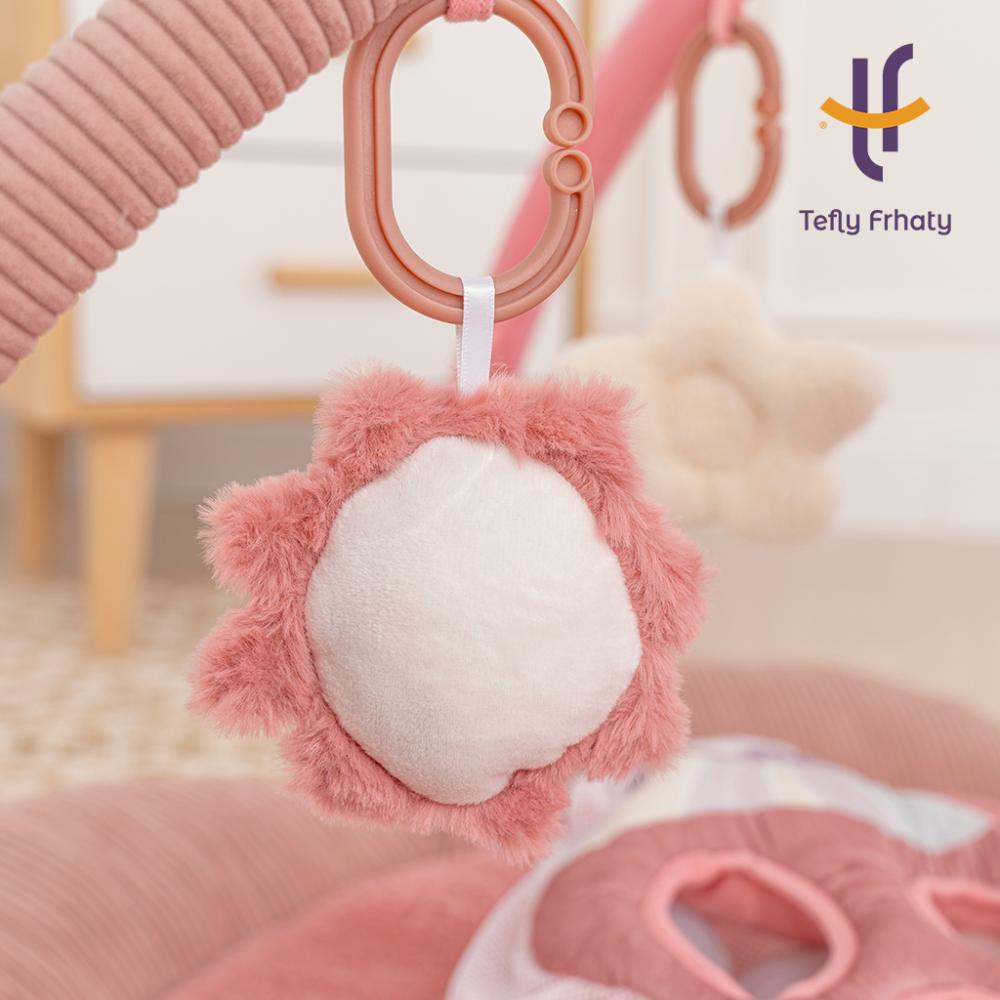 حصيرة لعب تفاعلية مثالية للأطفال منذ الولادة، مزودة بقاعدة ناعمة ومبطنة لتوفير بيئة آمنة ومريحة. تتميز بوجود قوسين مزودين بلعب ناعمة معلقة، مصممة لتحفيز التفاعل والمهارات الحركية للطفل.