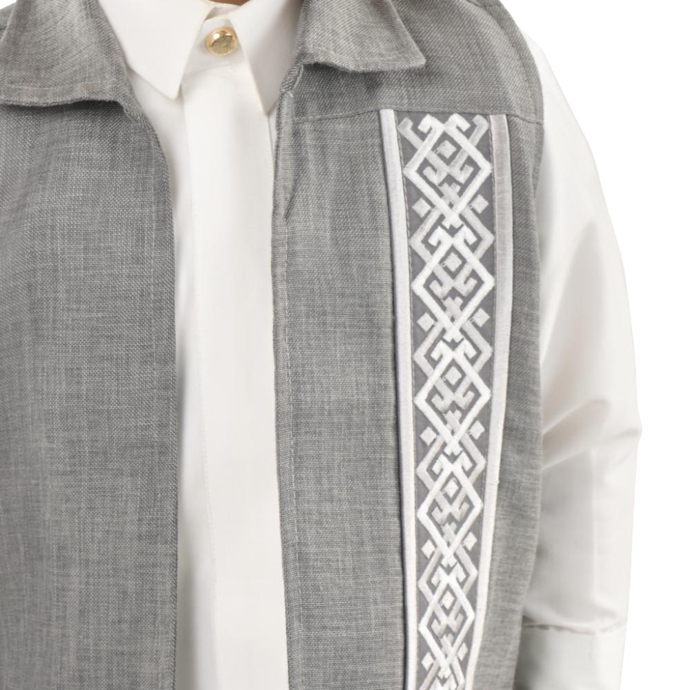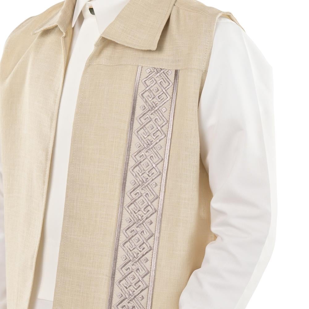 استلهمنا هذا التصميم من الزخارف الشرقية الغنية لنعزز الهوية الثقافية لدى أطفالنا، مع إضافة لمسة عصرية تناسب حيويتهم. التطريز الدقيق على الجهة الأمامية يبرز تفاصيل الماسية والصلبان المتكررة، مما يضفي طابعًا مميزًا يحمل "الأناقة الشرقية" في كل غرزة.