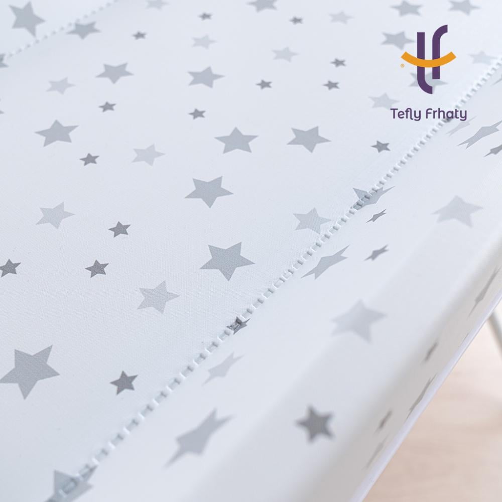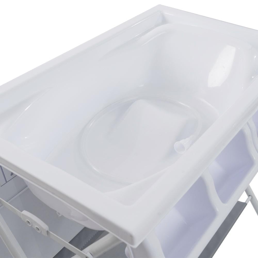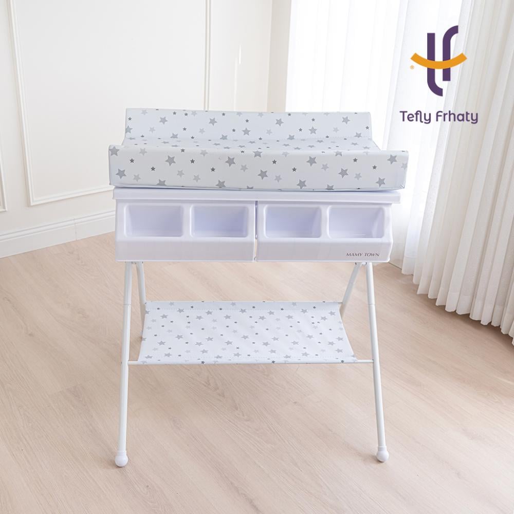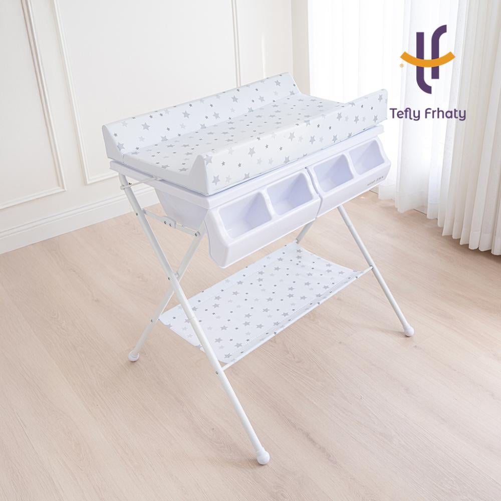 طاولة الغيار والاستحمام تأتي مع منظم لتخزين مستلزمات الطفل، مع حصيرة مبطنة. تم تصميمها بطريقة سهلة الطي لسهولة التنقل والتخزين.